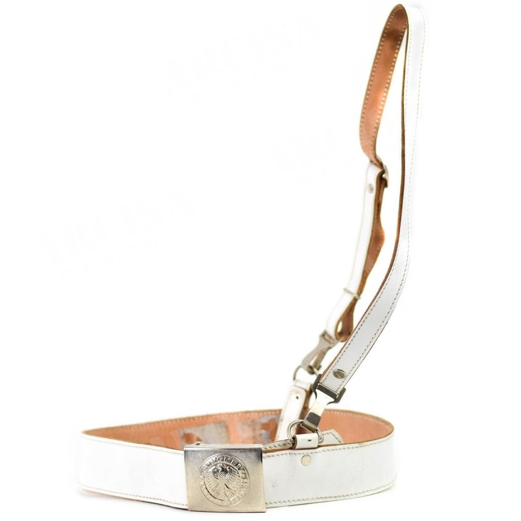 - Dieser aus hochwertigem Leder gefertigte Paradegürtel der Polizei zeugt von hervorragender Handwerkskunst und Liebe zum Detail. Seine auffällige weiße Farbe unterstreicht sein formelles und zeremonielles Erscheinungsbild. Der Gürtel verfügt außerdem über einen Schulterriemen, der seine königliche und würdevolle Ästhetik unterstreicht.