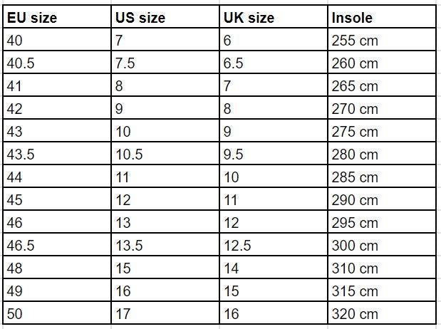 | EU -Größe | US -Größe | Großbritanniengröße | Einlegesohle |
