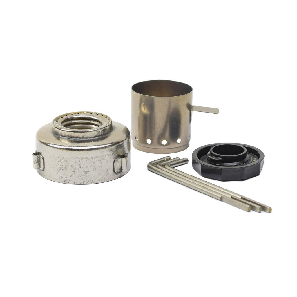 - SET INCLUDES : Brûleur avec bouchon à vis, cheminée, porte-casseroles en 3 pièces, boîte en bois