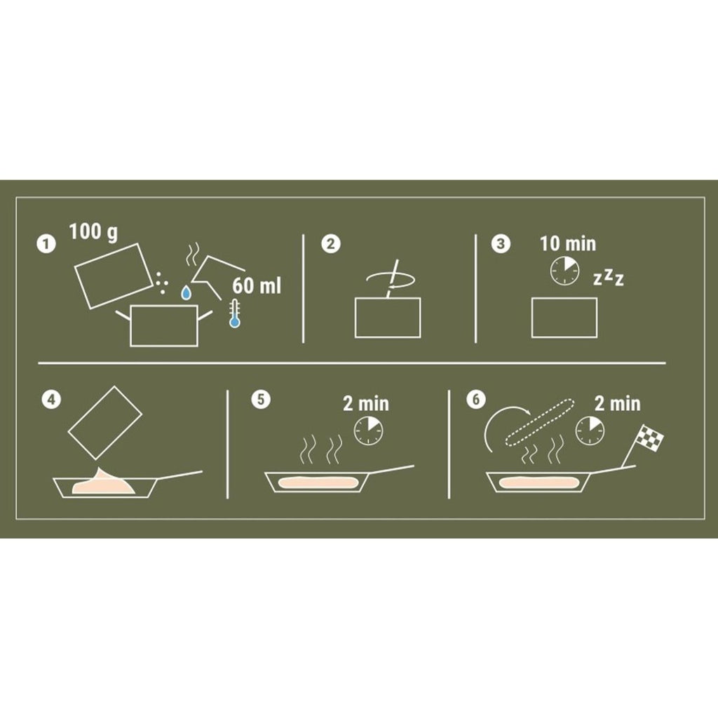 This field bread mix is an original German military-style outdoor food product, designed to provide freshly baked bread even in demanding field conditions. It is suitable for use during camping, trekking, expeditions, and as part of emergency or crisis food supplies.