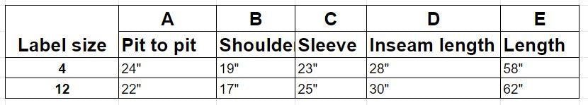 | Fosse | Épaules | Manche | Longueur de couture | Longueur | |