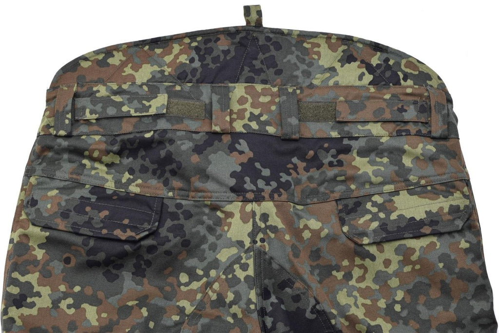 • Deze camouflagebroek, gemaakt van duurzaam ripstop-flecktarn-camouflagemateriaal, biedt uitzonderlijke prestaties. De verstelbare hoge taille zorgt voor een comfortabele pasvorm, terwijl de binnenbenen met ritssluiting en jarretellussen voor extra gemak zorgen.