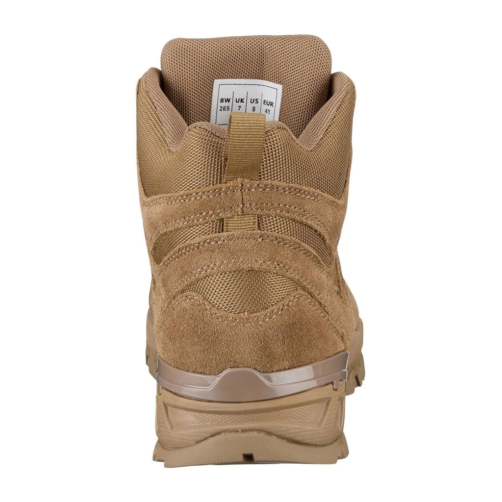 Deze coyote MIL-TEC squadlaarzen vallen op als suède laarzen met middelhoge kuit, ontworpen om de mobiliteit en robuuste enkelondersteuning te benadrukken.