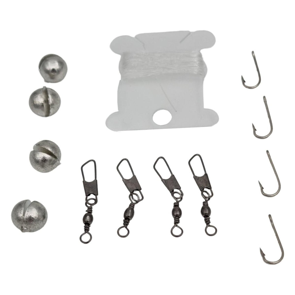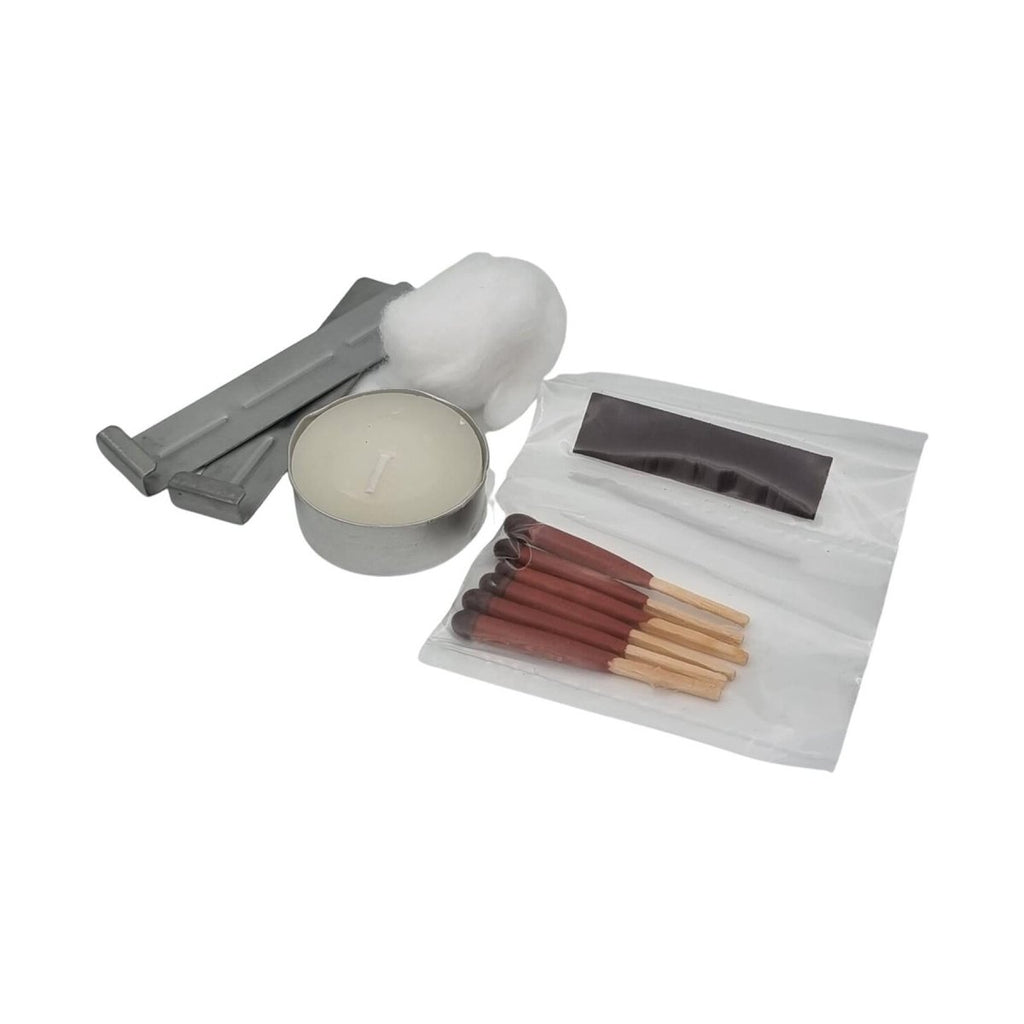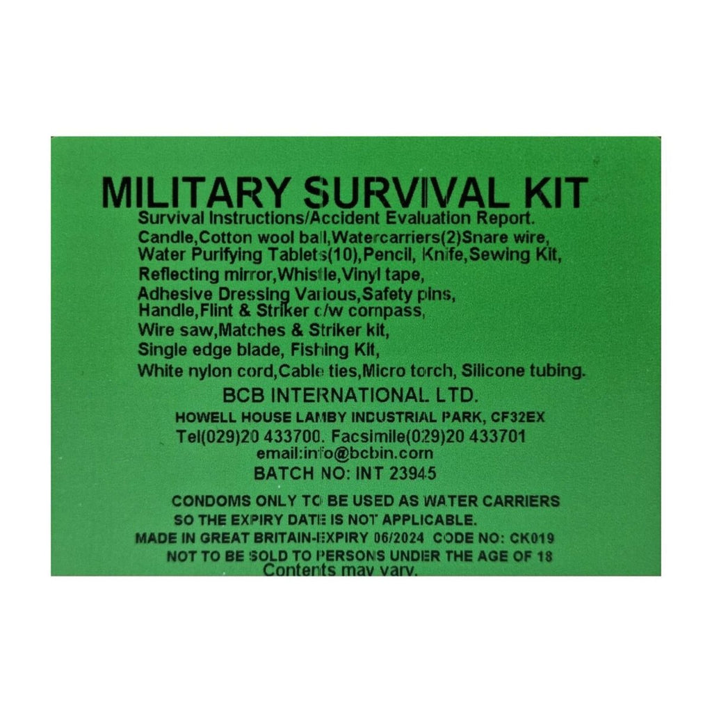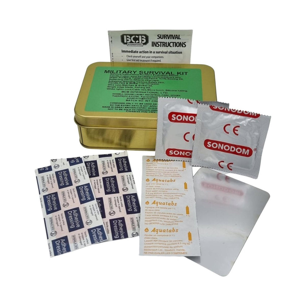 Zestaw zawiera: wodoodporną puszkę, taśmę winylową, zamykane ostrze noża, wodoodporne zapałki i wybijak, ołówek, tabletki do uzdatniania wody, drut werblowy, świeczkę nocną, krzemień i zapalnik kuli ognia z kompasem, zestaw wędkarski, gwizdek alarmowy, zestaw do szycia, agrafki, podstawową piłę drucianą, lusterko sygnalizacyjne, blaszany uchwyt do zawieszania, mikrolatarkę LED, waciki do hubki, jednosieczne maszynki do golenia, samoprzylepne sterylne plastry, niesmarowane prezerwatywy (nośniki wody), instrukcja przetrwania, formularz oceny wypadku.