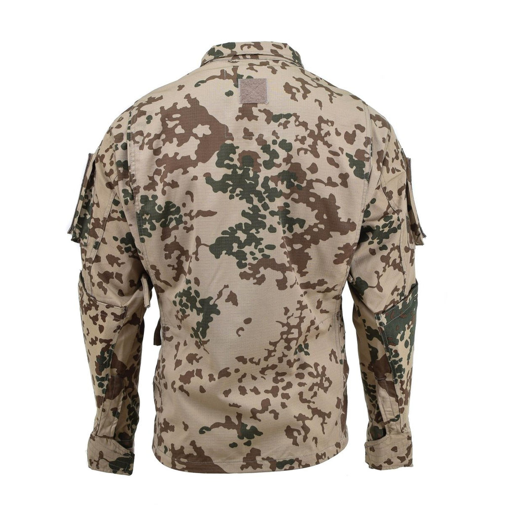• Koszulka Desert Flecktarn Combat Shirt wykonana jest z wytrzymałego materiału ripstop i jest odporna na rozdarcia i otarcia. Dzięki temu jest to niezawodny wybór w trudnych warunkach, w których inne materiały mogą zawodzić. Konstrukcja koszuli obejmuje wzmocnione łokcie, zapewniające dodatkową trwałość w obszarach narażonych na duże obciążenia. Ma również zapinany na guziki przód i wiele kieszeni, dzięki czemu masz mnóstwo miejsca na przechowywanie niezbędnych rzeczy, takich jak mapy, narzędzia czy urządzenia komunikacyjne.