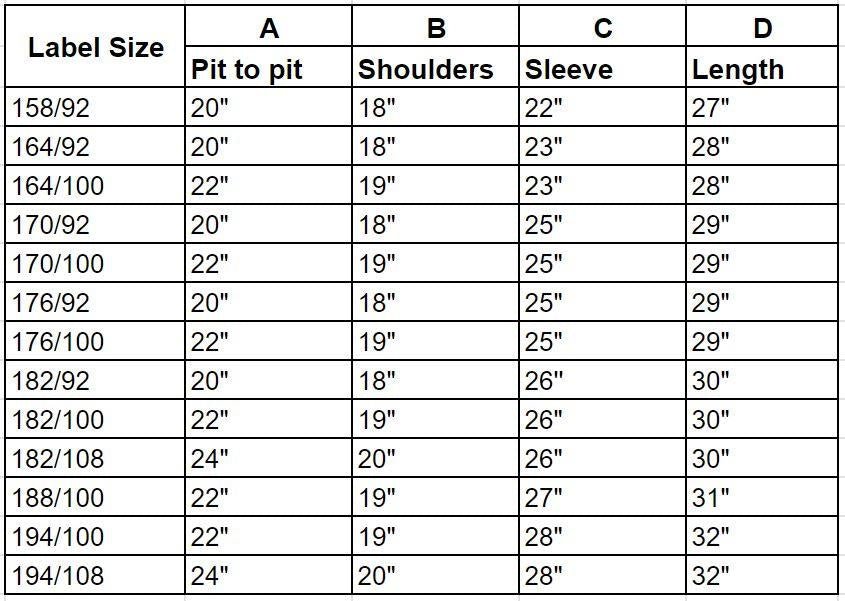 | Pit to pit | Shoulders | Sleeve | Length | |